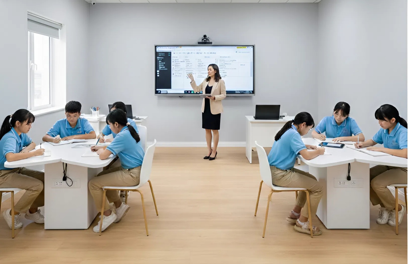 Điều này không đồng nghĩa với việc tất cả học sinh luôn phải hướng lên bảng. Với những giờ học cần trao đổi, một cấu trúc mở sẽ giúp ánh nhìn được phân bổ đều hơn, giảm cảm giác bị “độc thoại” từ phía giáo viên.